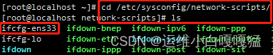 使用cd /etc/sysconfig/network-scripts/进入存放网卡配置文件的目录,在使用ls查看文件中有那些网卡配置可以看到只有ens33,没有ens37