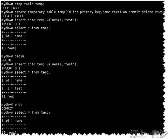 默认情况下,创建的临时表是会话级的,如果需要创建事务。需要添加“on commit delete rows”子句。(注:“on commit”子句形式有三种:“on commit preserve rows”,默认值,会话级;“on commit delete rows”,事务级,事务结束,删除数据;“on commit drop”,事务级,事务结束,删除临时表)
