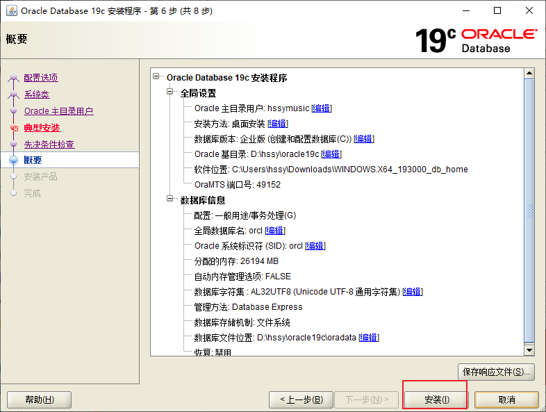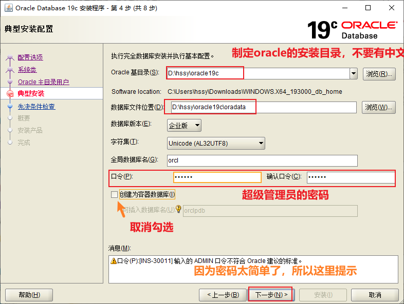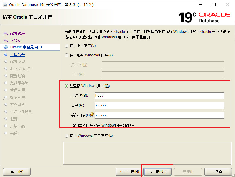 指定Oracle主目录用户这一步需要注意,原博主采用了创建Window用户的方法,由于我本机没有新建用户所以勾选了使用Windows内置账户。