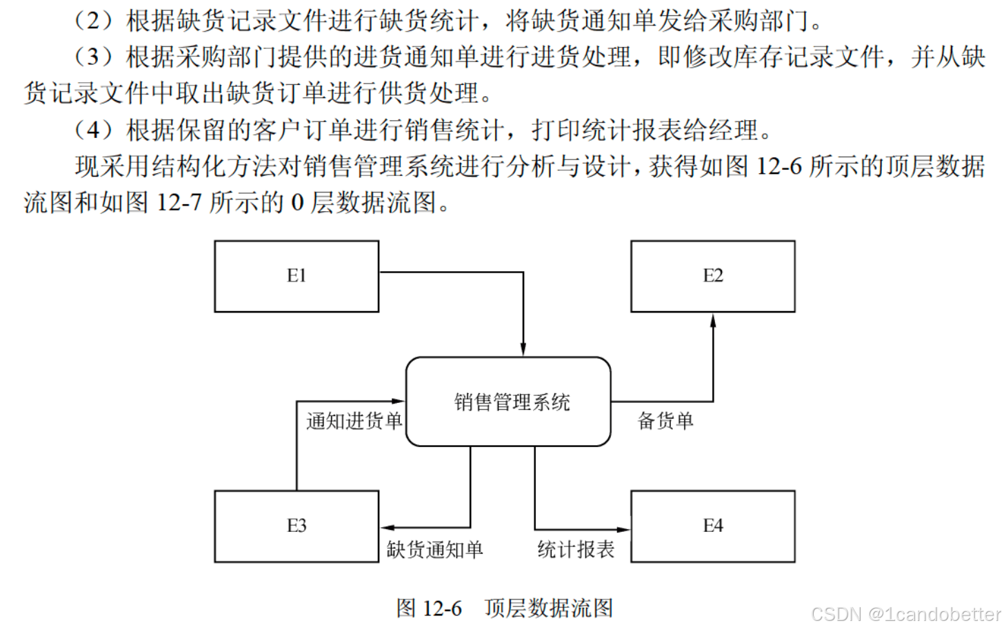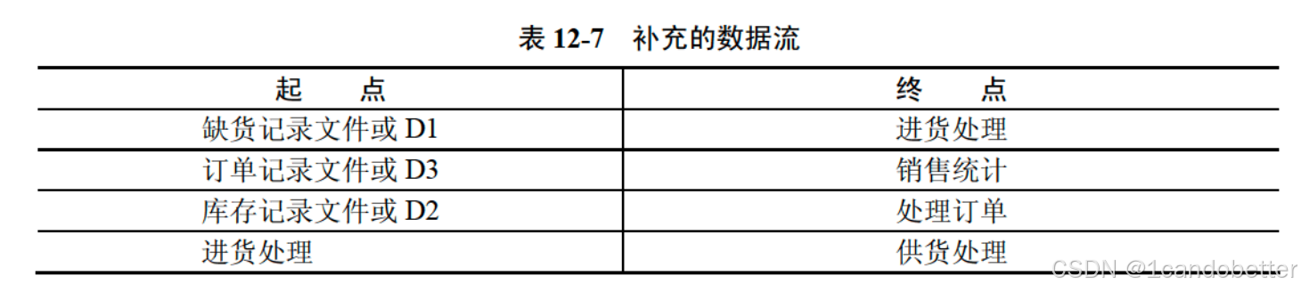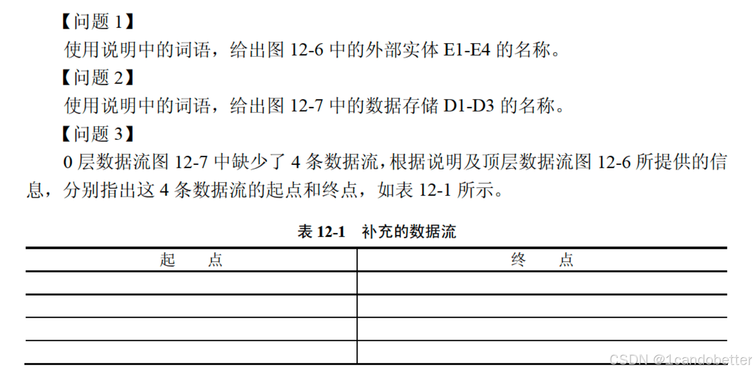 4、问题 3:0 层数据流图 12 - 7 中缺少了 4 条数据流,根据说明及顶层数据流图 12 - 6 所提供的信息,分别指出这 4 条数据流的起点和终点,填写在表 12 - 1 中。
