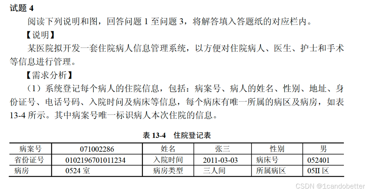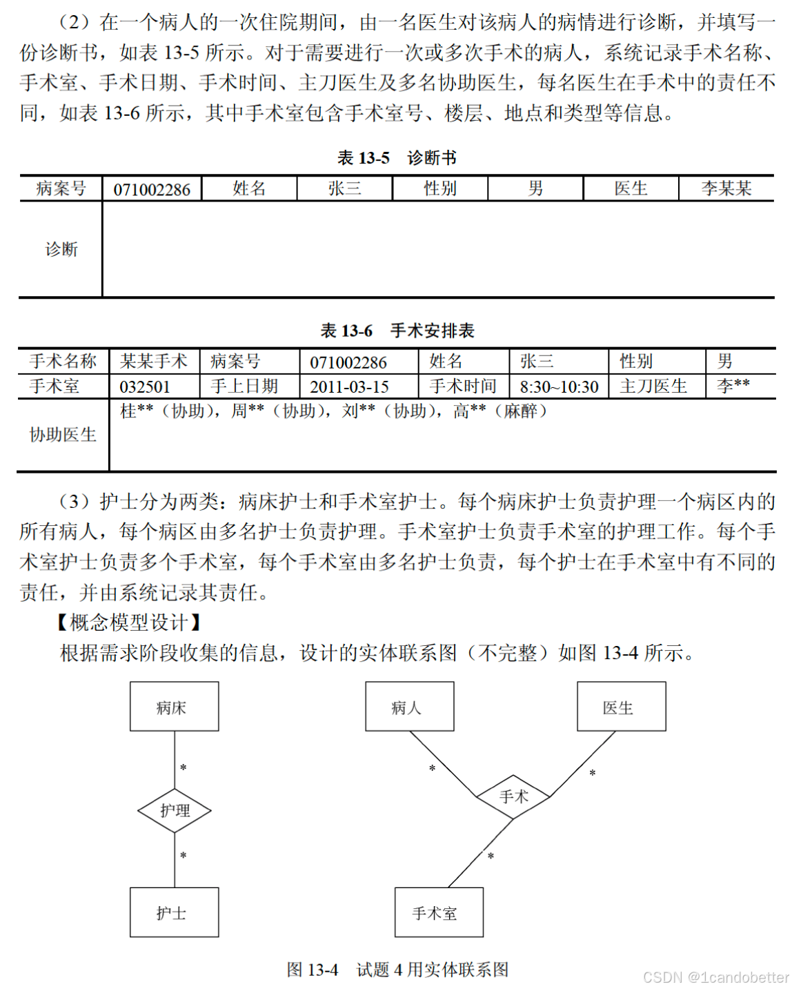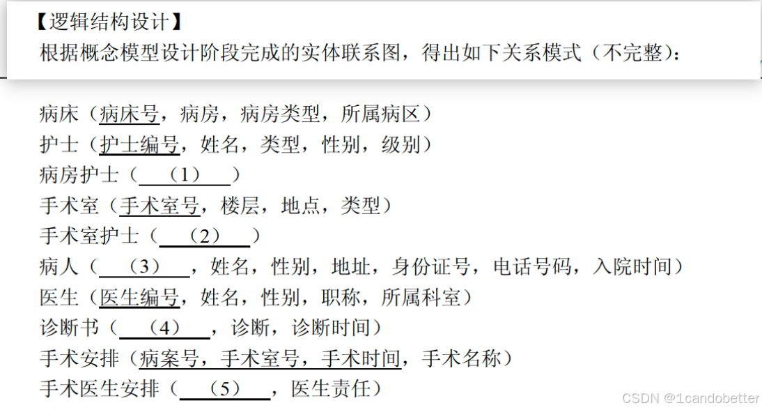 3、【问题2】根据图13-4,将逻辑结构设计阶段生成的关系模式中的空 (1)~(5) 补充完整,并用下划线指出主键