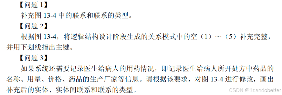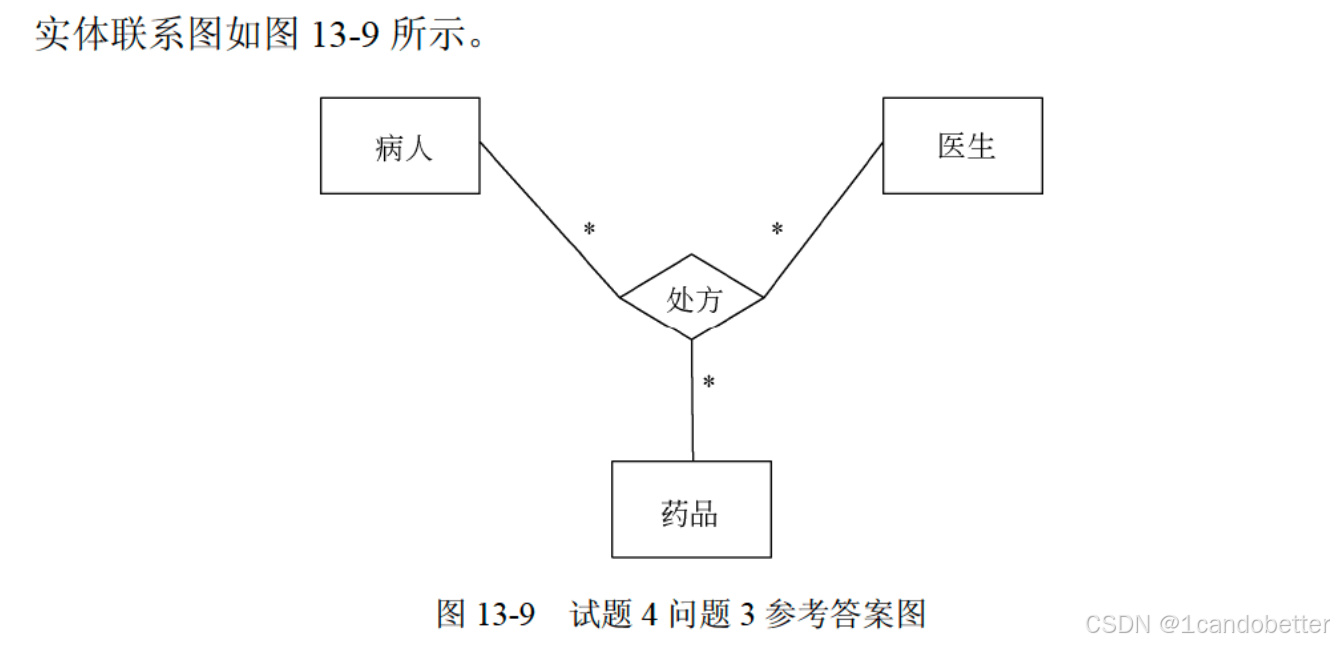4、【问题3】如果系统还需要记录医生给病人的用药情况,即记录医生给病人所开处方中药品的名称、用量、价格、药品的生产厂家等信息。请根据该要求,对图13-4进行修改,画出补充后的实体、实体间联系和联系的类型