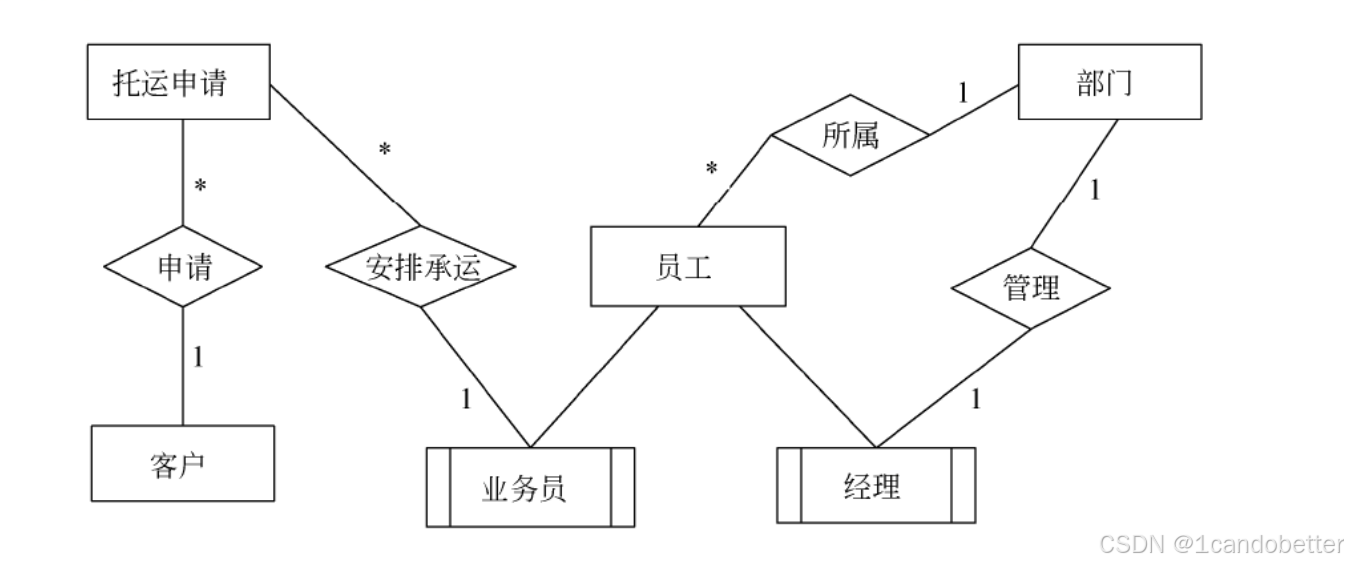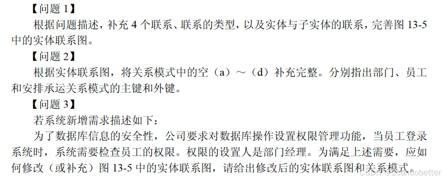 2、【问题1】根据问题描述,补充4个联系、联系的类型,以及实体与子实体的联系,完善图13-5中的实体联系图。