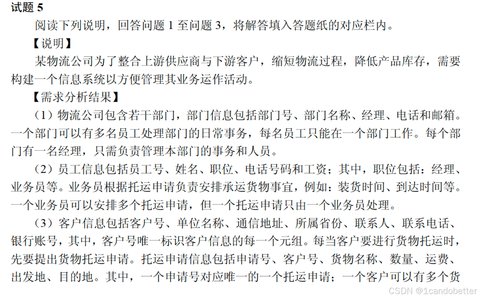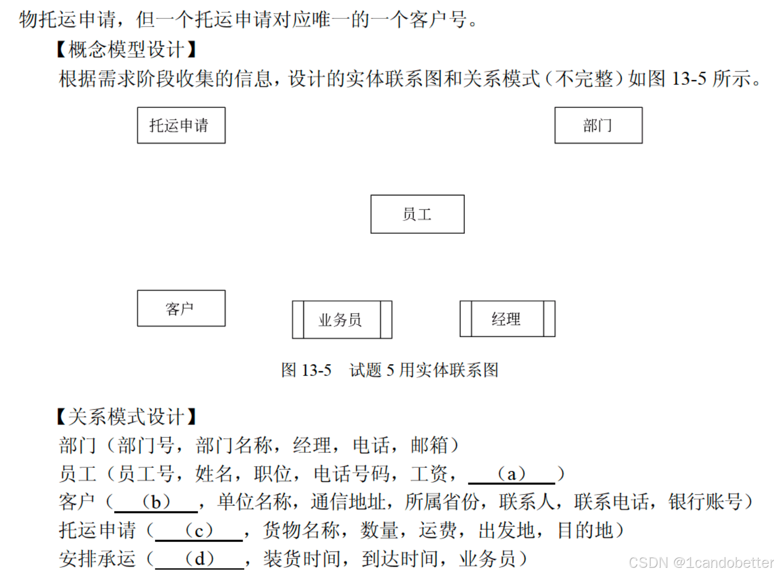 3、【问题2】根据实体联系图,将关系模式中的空 (a)~(d) 补充完整。分别指出部门、员工和安排承运关系模式的主键和外键
