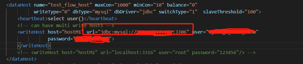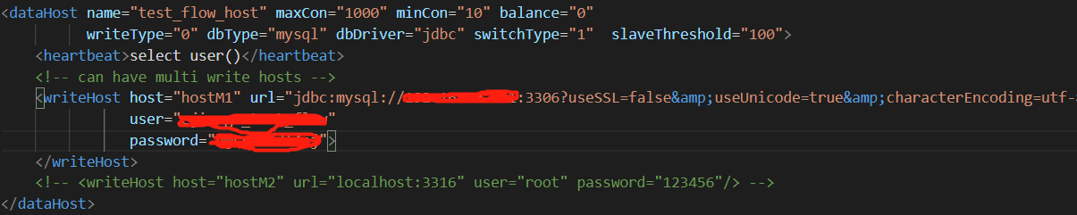 url: jdbc:mysql://[数据库ip地址]:[端口号]/[数据库]?useSSL=false&useUnicode=true&characterEncoding=utf-8&zeroDateTimeBehavior=convertToNull&transformedBitIsBoolean=true&tinyInt1isBit=false&allowMultiQueries=true&serverTimezone=GMT%2B8&nullCatalogMeansCurrent=true&allowPublicKeyRetrieval=true但是,我的url设置很完整,所以我的问题没有得到解决,到这里变的一筹莫展,只好先放下不管了。大概过了两天,我在调试数据库读写分离的时候看到了mycat的配置。也就是说我的所有url都被mycat代理了,原先的url设置已经不生效了。