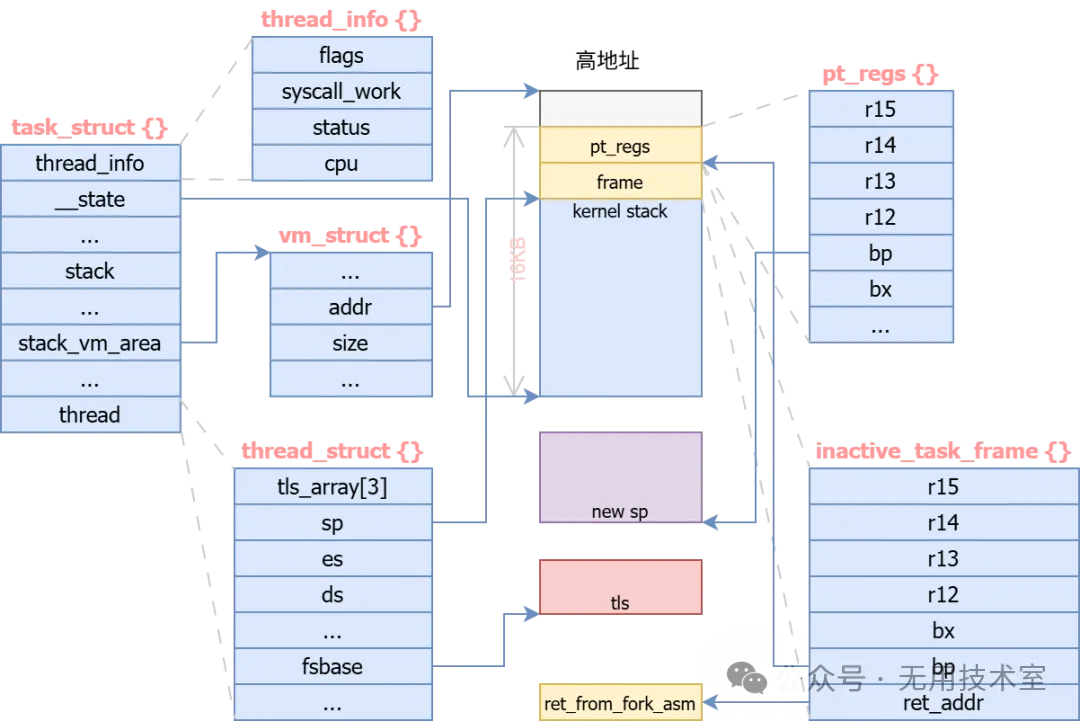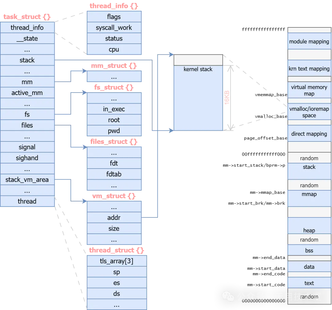 - stack内核栈,默认大小16KB,stack_vm_area表示使用vmalloc分配的内核栈内存区域