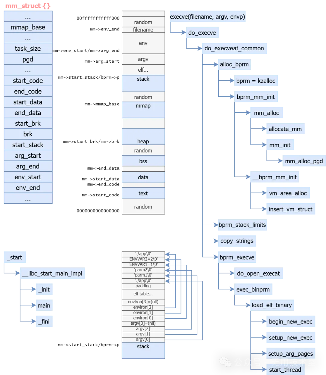 - begin_new_exec:设置新的mm_struct数据结构,刷新页表