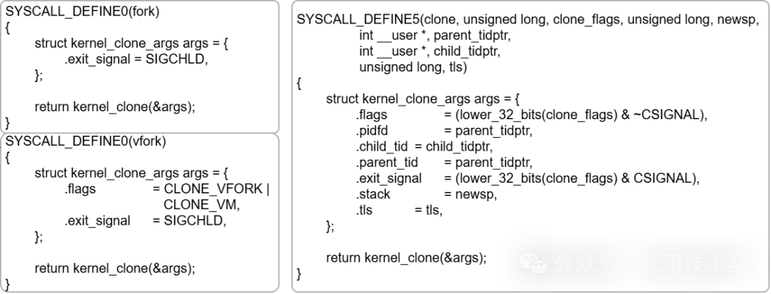 Linux也没有提供创建进程和线程的系统调用,fork/vfork/clone统一调用kernel_clone()函数创建一个task。
