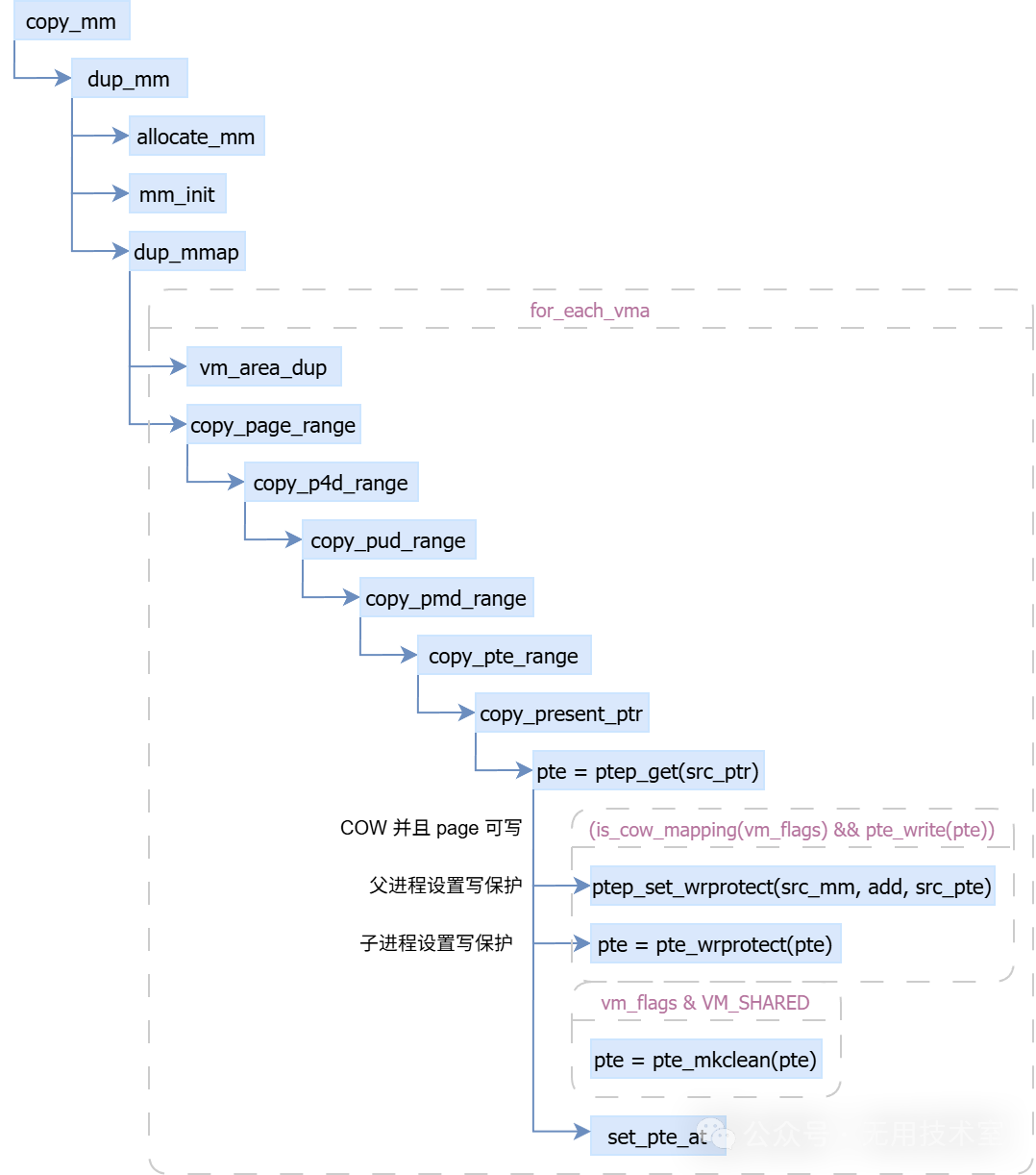 当使用CLONE_VM时,copy_mm()函数直接使用父进程的mm;否则调用dup_mm复制父进程的虚拟内存空间:遍历每个vma,复制页表: