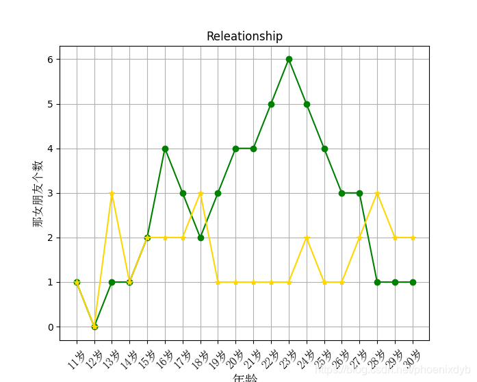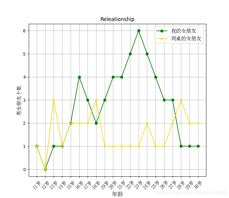 每年交的男女朋友的数量如列表a和b,请绘制出该数据的折线图,以便分析自己和同桌每年交男女朋友的数量走势