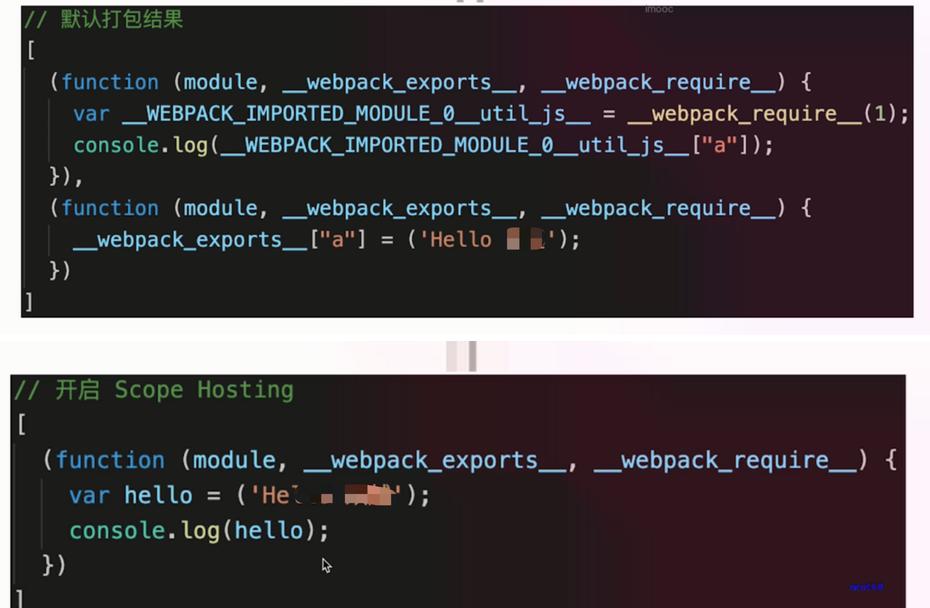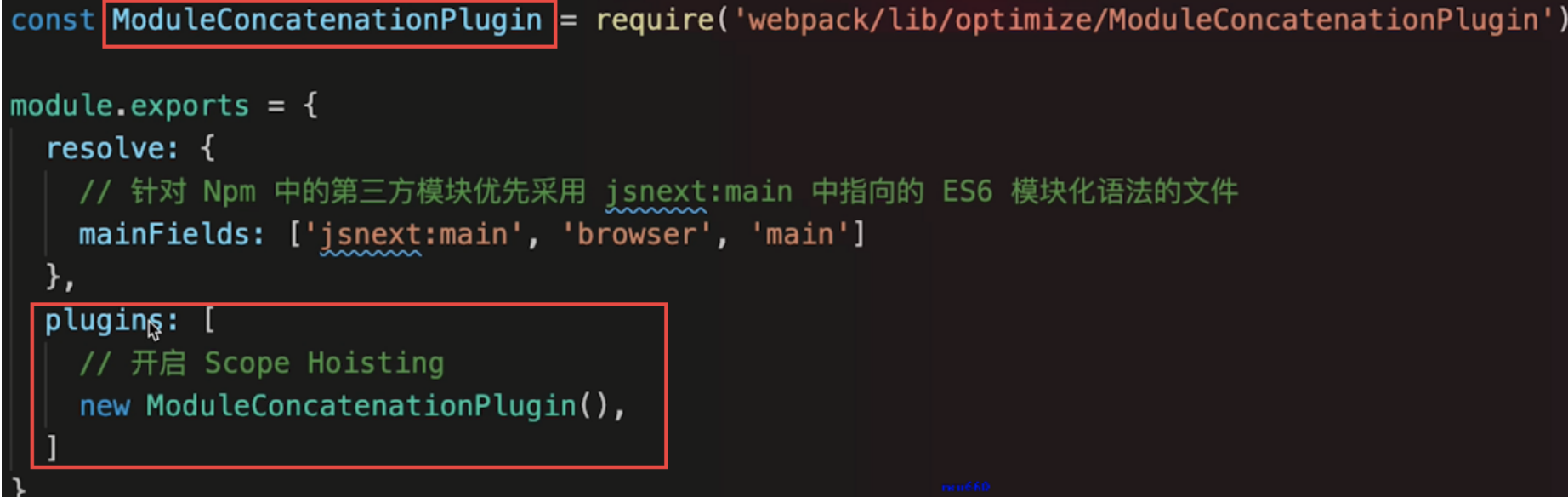 scope hoisting: 作用域提升,将分散的模块划分到同一个作用域中,避免了代码的重复引入,有效减少打包后的代码体积和运行时的内存损耗;