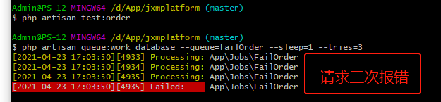 php artisan queue:work database --queue=failOrder --sleep=1 --tries=3