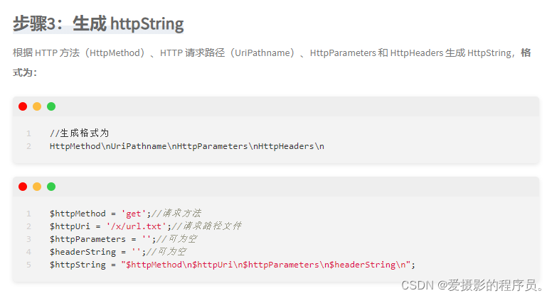 $httpString = "$httpMethod\n$httpUri\n$httpParameters\n$headerString\n";