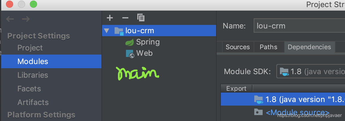 本人导入一个名称为CU的项目后,打开 File——>Project Structure...,点击左侧的Modules,发现除了名称为CU的module,还有一个“main”和一个“test”,通过查看详细信息发现“main”和“test”都属于“CU”这个项目。