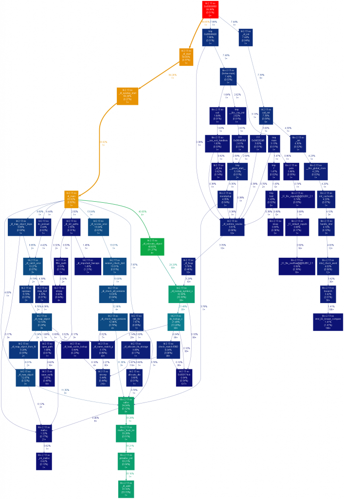 再来看 Callgrind的生成调用图过程吧,执行:valgrind --tool=callgrind ./tmp,执行完成后在目录下生成"callgrind.out.XXX"的文件这是分析文件,可以直接利用:callgrind_annotate callgrind.out.XXX 打印结果,也可以使用:gprof2dot.py -f callgrind callgrind.out.XXX |dot -Tpng -o report.png 来生成图形化结果: