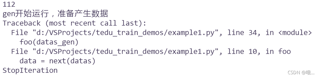 112证实了无论“机器”的生产能力变成什么样,“机器”的大小都不会改变。控制台打印了"gen开始运行,准备产生数据 ",说明生成器确实启动了,但是现在导致程序错误的是一个名为StopIteration的异常。这个StopIteration是从哪里来的呢?