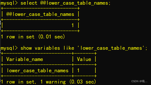 lower_case_table_names = 1 表名存储在磁盘是小写的,但是比较的时候是不区分大小写
