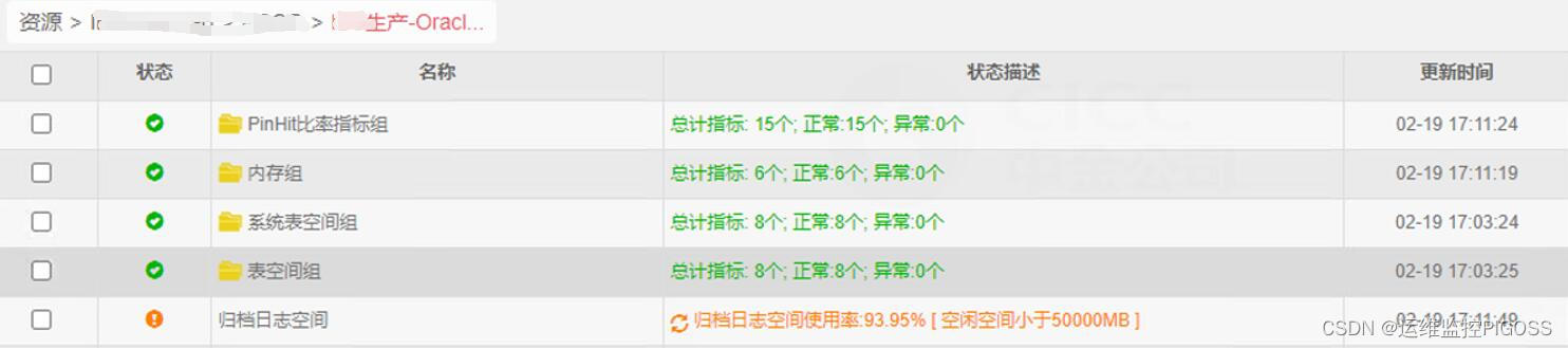 归档日志空间使用满了后,会导致数据库不可用,所以日常运维中需要对该指标进行实时监控,保证业务的正常运行。