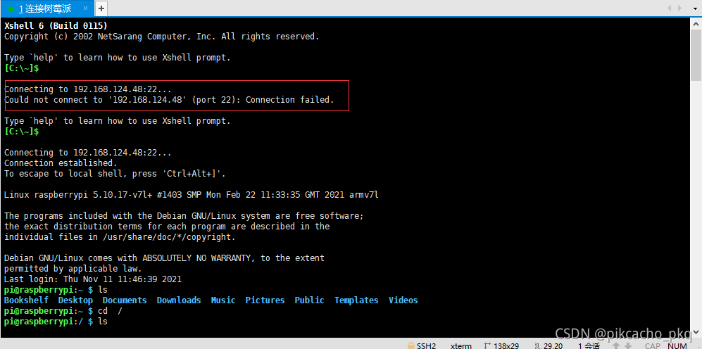 我这里使用xshell来连接树莓派,通过树莓派的ip地址和用户名密码来连接树莓派。首次连接可能会出现连接失败的情况。