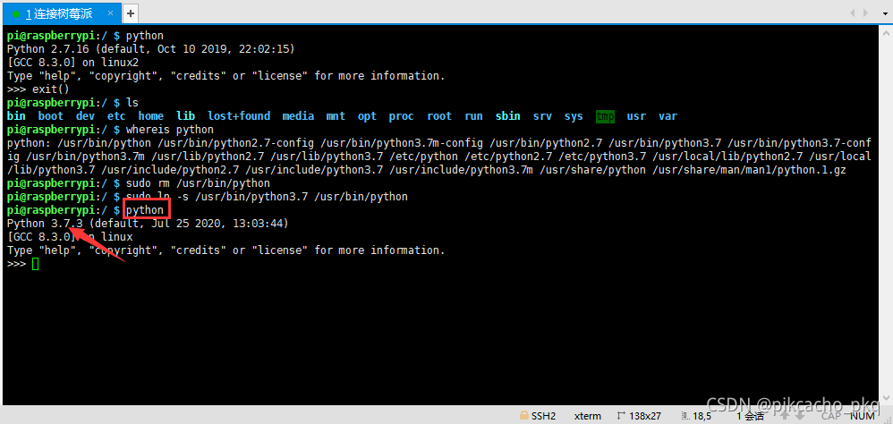 注意这里写python3.7是根据你实际查询出来的版本,我的是3.7,所以这里写3.7;如果你是3.4就写3.4。再运行python即可看到默认是python3了。