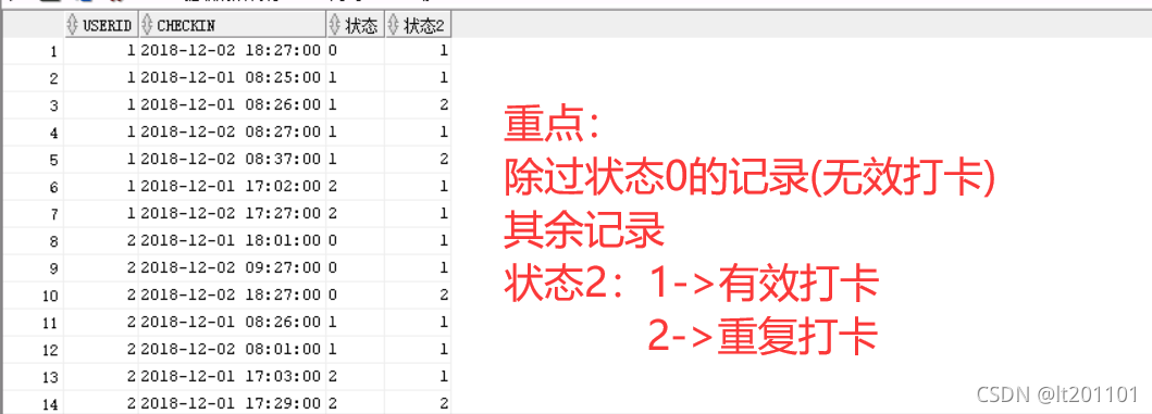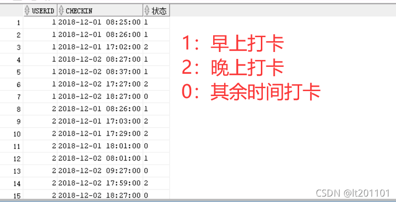 难点:可以配合以下SQL结果理解:剔除状态为0非要求时间范围之外打卡记录,剩下的都是时间范围内打卡,