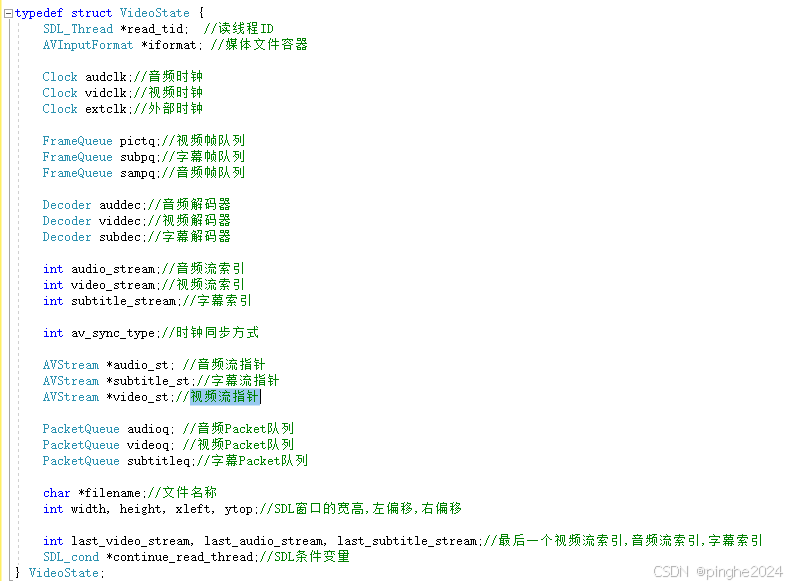 是ffplay的全局管理器,记录各种数据状态(时钟,队列,解码器等)。先看VideoState的部分字段