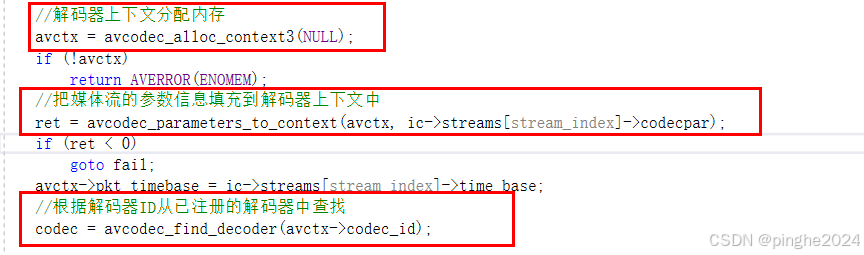 对于音频和视频,前面的操作都是一致的,分配解码器上下文AVCodecContext,并把媒体流的参数信息填充到新分配的解码器上下文avctx中,接下来根据解码器ID,从已经注册的解码器中,寻找对应的解码器。