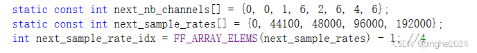 首先定义了两个数组next_nb_channels和数组next_sample_rates,这两个数组是打开音频设备失败时用到的,实际运行时一般都可以找到音频设备,暂不分析。