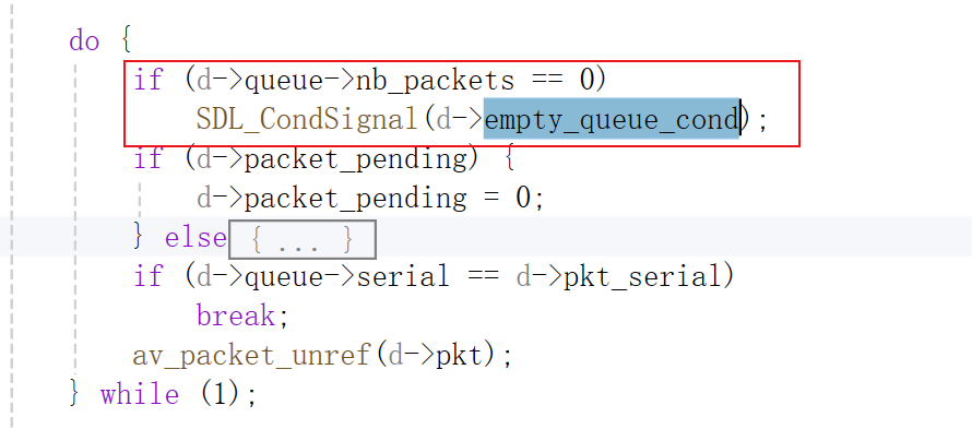 SDL_CondWaitTimeout()在10毫秒后,如果没有收到其他线程发送信号,会自动返回继续continue循环等待10毫秒。如果收到信号,SDL_CondWaitTimeout()会立即返回读取数据,此时说明解码线程没有数据可解码了,解码线程发送信号在以下代码处:
