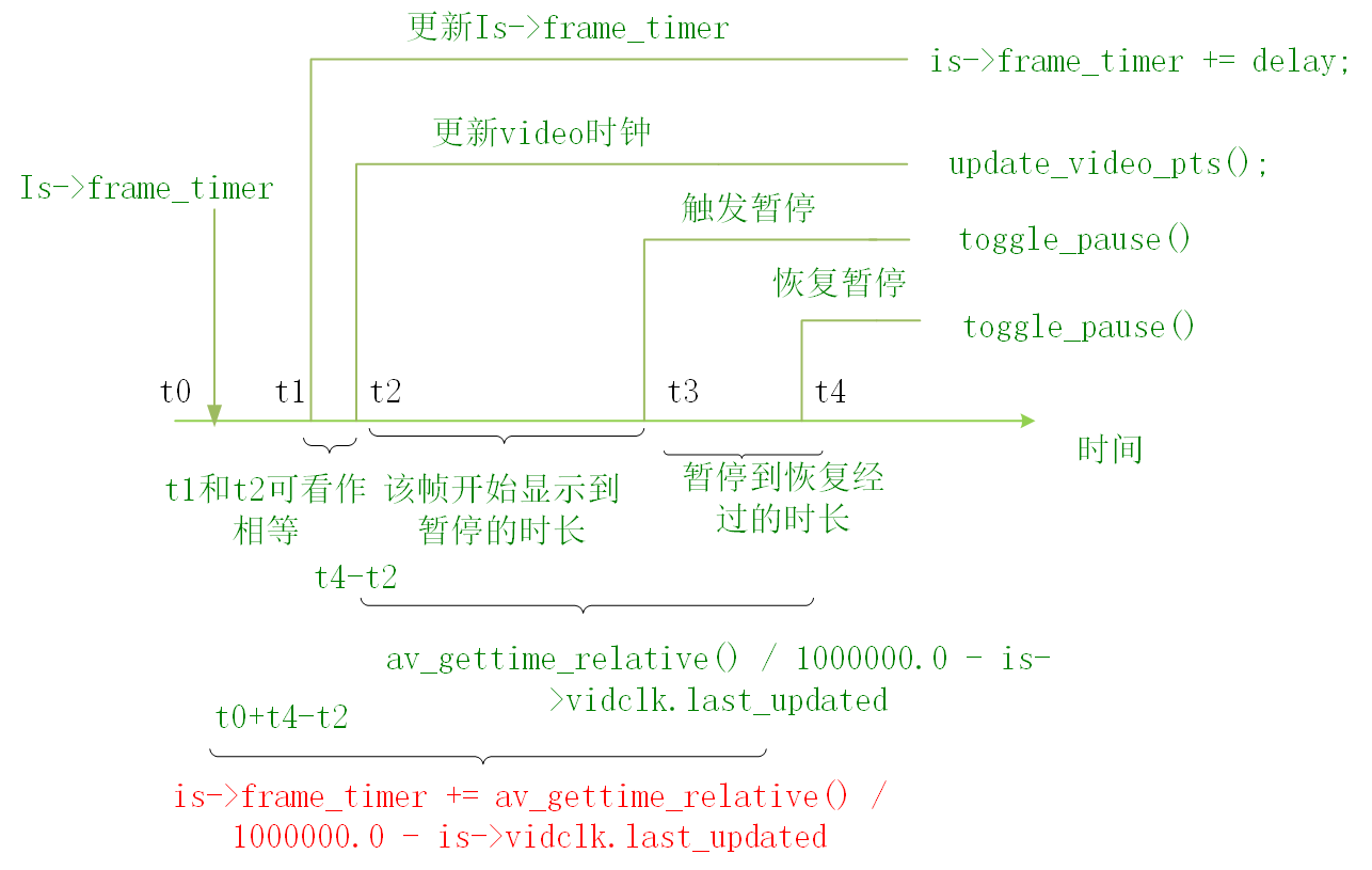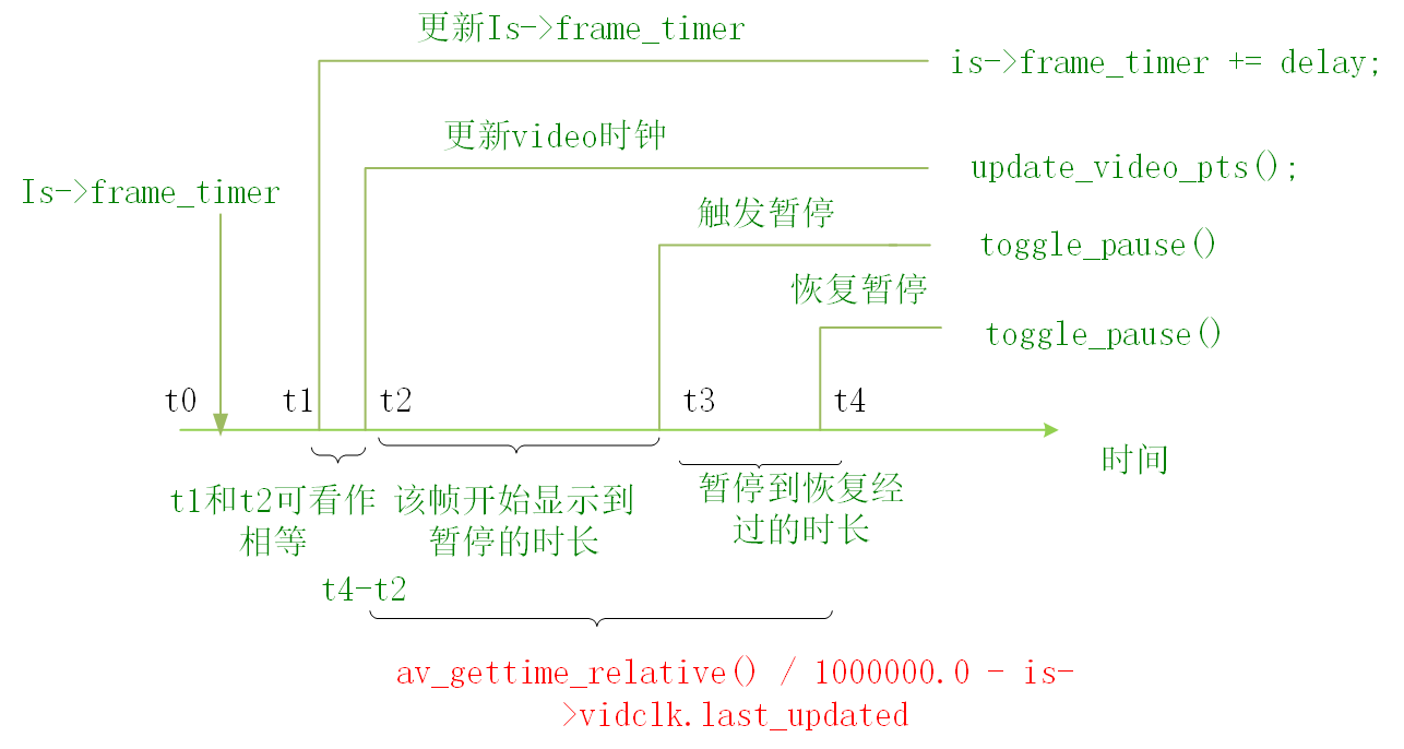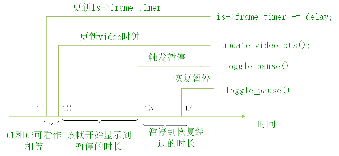 t1是执行is->frame_timer += delay的时间,t2是执行update_video_pts()的时间,t3是暂停时间,t4是恢复播放时间。
