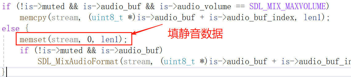 在sdl_audio_callback()中,音频暂停时运行到if(is->paused)处会立即返回,此时向SDL填充的都是静音数据