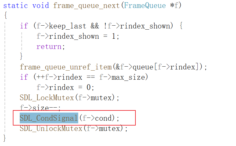 1)视频播放线程调用frame_queue_next()-->SDL_CondSignal()发送信号后,frame_queue_peek_writable()-->SDL_CondWait()被唤醒继续向下运行,开始消费视频PacketQueue的数据。
