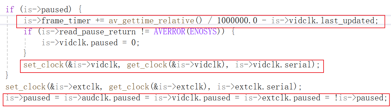 此时的时钟保存的last_updated是暂停前的最后一次更新的系统时间,pts_drift是根据last_updated和pts计算的。如果再用get_clock()获取视频时钟时,计算的值是错误的。比如视频在10:00暂停了,过了10秒恢复播放,那么恢复播放1秒后,用get_clock()获取的时钟是pts+11秒,实际视频才播放了一秒,视频时钟应该是pts+1。所以视频时钟的last_updated应该修改为恢复播放时的系统时间,下面代码的作用就是如此。
