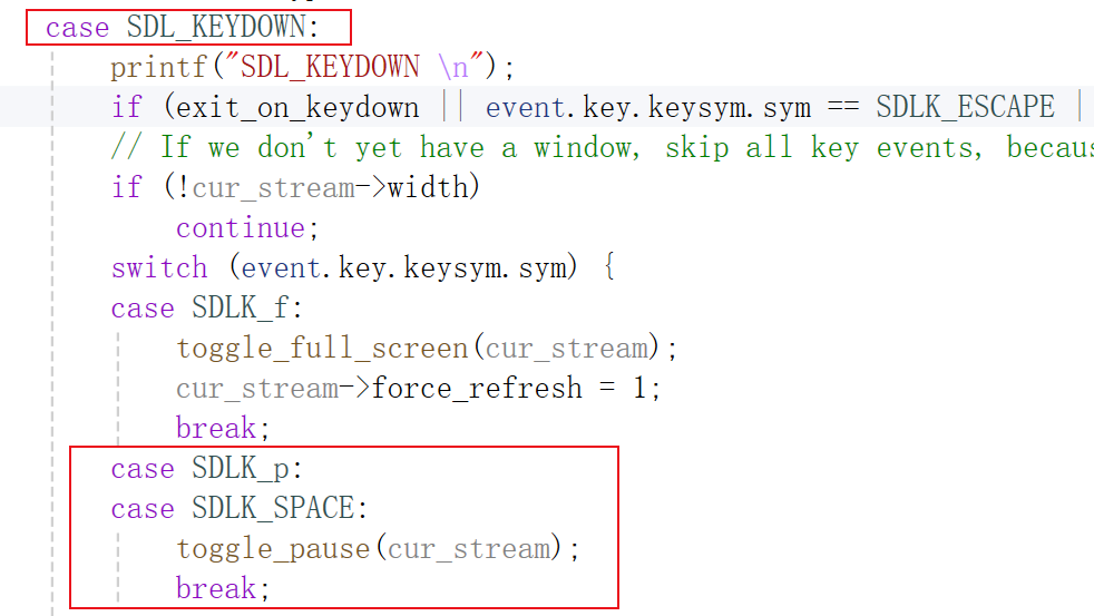 当按下键盘的空格键或P键时,产生键盘按下事件SDL_KEYDOWN,执行toggle_pause()。