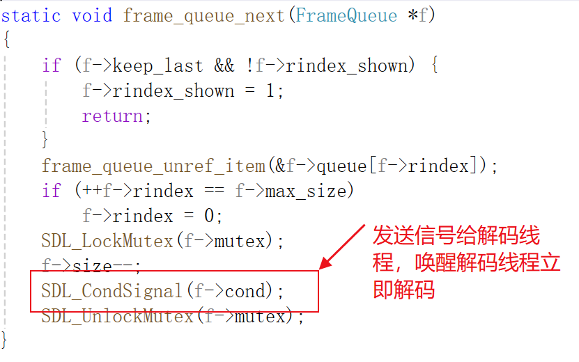 同时在frame_queue_next()中同视频一样,通过调用SDL_CondSignal()发送信号给音频解码线程audio_thread,唤醒audio_thread继续解码。