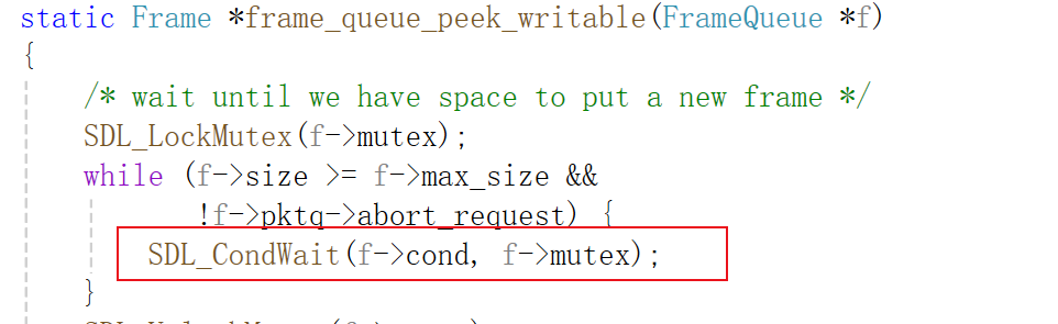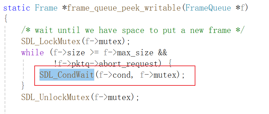 音频解码线程和视频解码线程都阻塞在frame_queue_peek_writable()中,若消费线程的frame_queue_next()不发送信号的话,会一直阻塞,直到收到信号为止