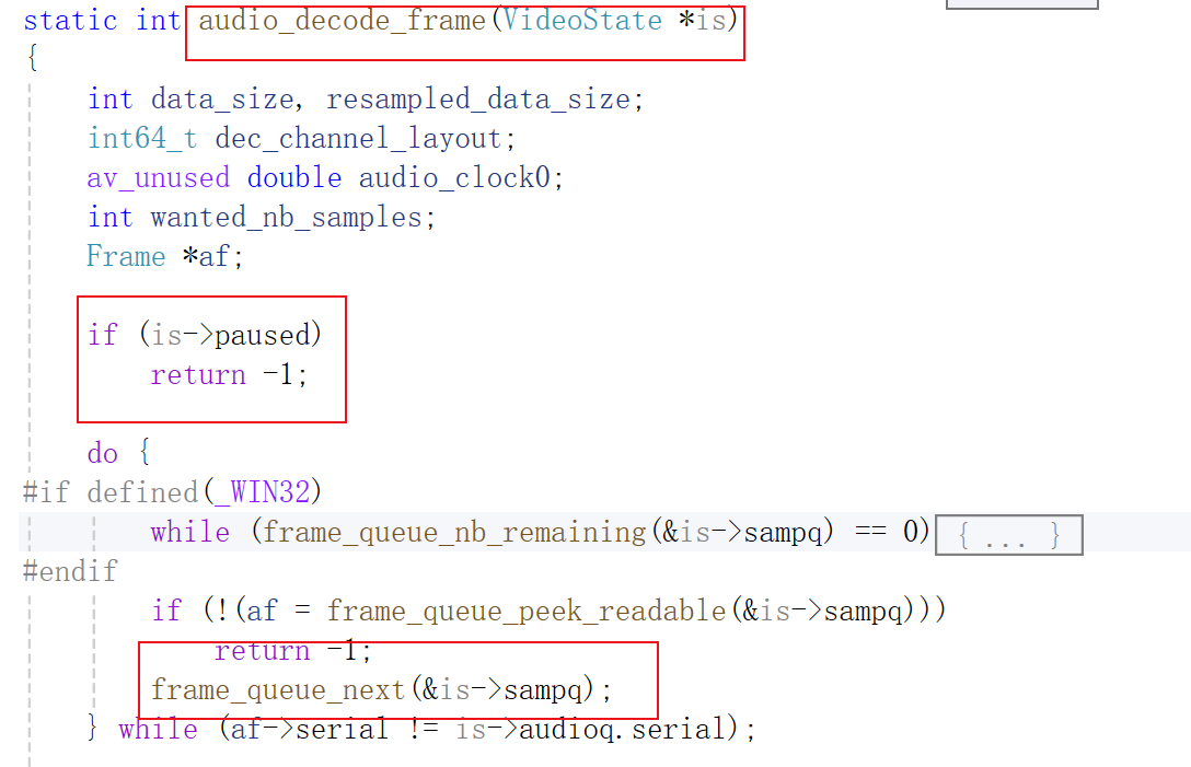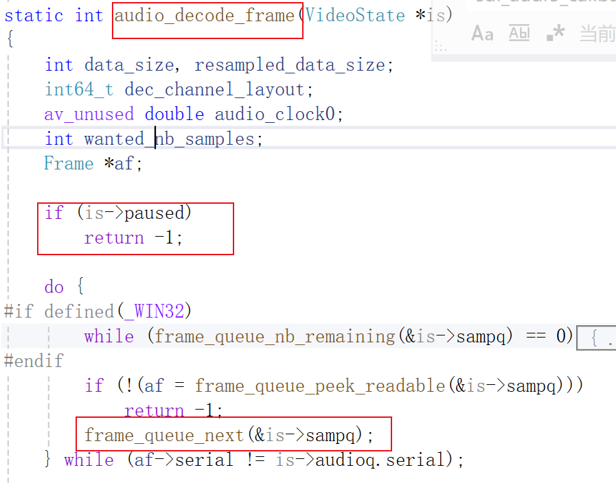 音频回调函数是sdl_audio_callback(),暂停状态下,sdl需要填充数据时程序运行到audio_decode_frame()后立刻返回-1,也就是说SDL取不到解码后的音频数据了