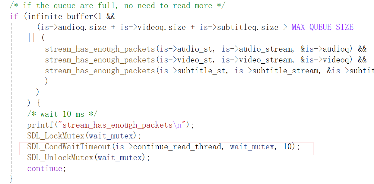 再回到read_thread线程中,由于解码线程不再从PacketQueue中get数据解码,read_thread一直读取数据的话,会导致PacketQueue越来越大,所以read_thread线程会在以下代码处休眠并等待超时,