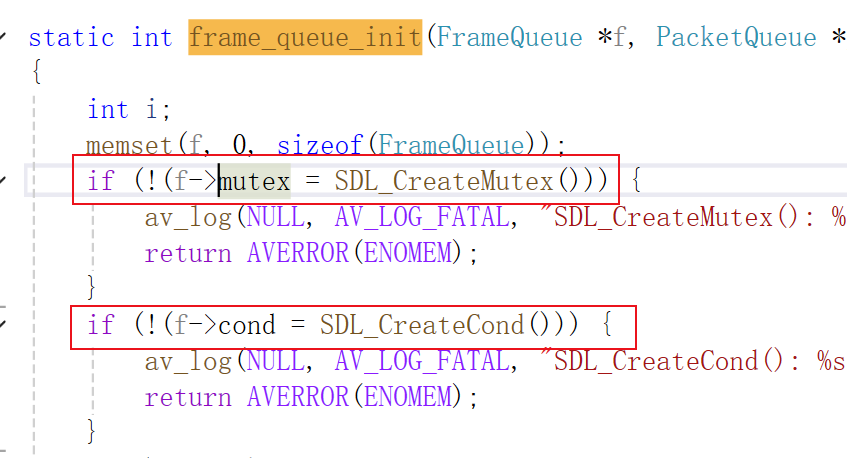 注:音频FrameQueue和视频FrameQueue中的条件变量和锁都是独立的,在初始化FrameQueue的函数frame_queue_init()中,各个队列创建自己的条件变量和锁。