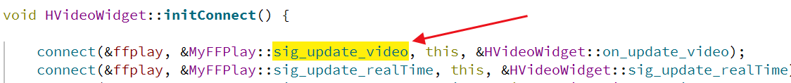 在void HVideoWidget::initConnect()中,sig_update_video信号连接到槽函数on_update_video()