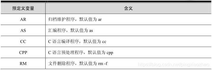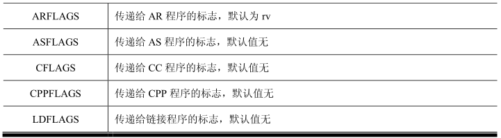 make 的预定义变量用于定义程序名称以及传递给这些程序的参数和标志位等。