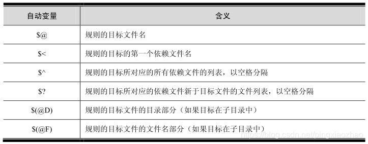 自动变量不用定义,且会随着上下文的不同而发生改变。make 的自动变量都是一些比较难记住的符号,都以美元符号($)开头。