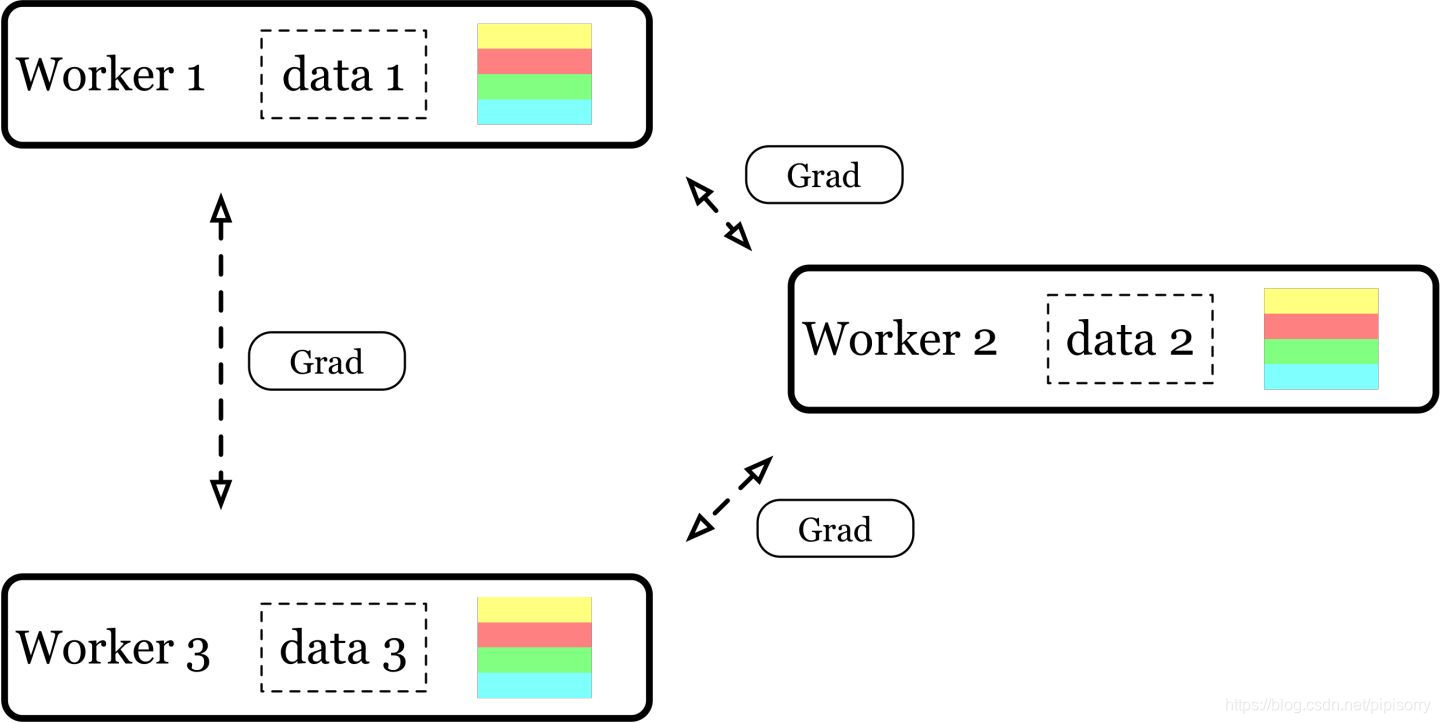 参数 𝜃 的变化来自于使用各个 node 算出的梯度对其进行的更新。如果在初始化的时候便同步了所有 node 拿到的参数拷贝 𝜃_i ,并在参数更新之前对梯度进行同步,这样在任何时刻各个 node 的参数拷贝 𝜃_i 都是一致的。所以我们可以以梯度为同步基础,间接实现参数 𝜃 的同步。而梯度的同步则依赖于 allreduce 操作(peer-to-peer 的通信)的高效实现。在 Allreduce 模式中,所有 node 同时充当 ps 和 worker 的角色。
