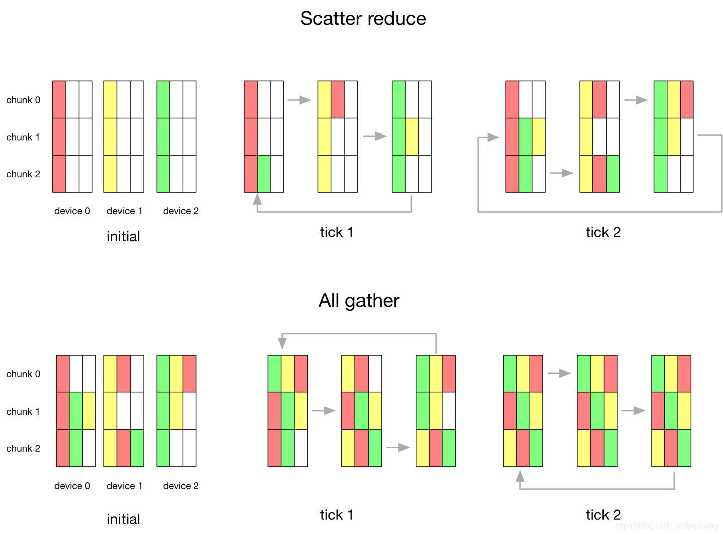 1. scatter-reduce:会逐步交换彼此的梯度并融合,最后每个 GPU 都会包含完整融合梯度的一部分。