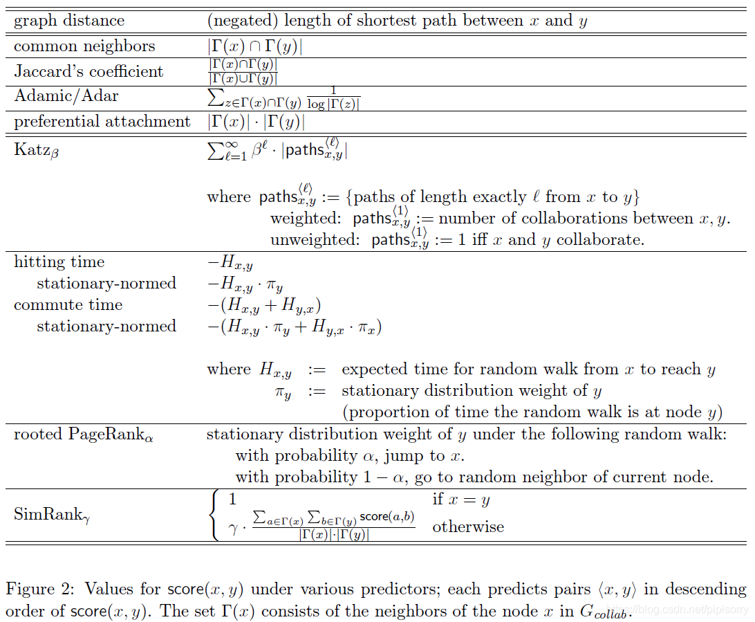 去掉分母的话不就是共同好友数么?是的,Adamic/Adar就是对中间节点(intermediate node)的节点做了一个加权,中间节点的度数越大,它的权重越小(其实就是neighbers出度加权的common neighbers)。但是实际应用中它的效果却非常好,Facebook在WSDM’11上发表了一篇文章,Supervised Random Walks: Predicting and Recommending Links in Social Networks,用random walk来做link prediction,费了半天劲在最后的评测上只比Adamic/Adar好了一点点,学术意义大于实际意义,当然Facebook线上用的肯定还有其他算法。