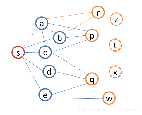 公式看起来有点抽象,我们来看一个具体的例子:在图1中,s是主节点,[a, b, c, d, e, f]是s的好友集合,[r, p, q, w]是s的2-hops邻居节点。假设我们要为s推荐好友,你会怎么做呢?很容易可以想到计算共同好友数(Common Neighbors),比如q和s有3个共同好友,r和s有2个共同好友,这样推荐的顺序是: q = p > r > w。我们用T(s)来表示节点s的度数,我如果告诉你,T(r)=10,T(q)=300,你觉得这样推荐合理么?这样看似乎先推荐r更合理,于是我们又可以想到Jaccard’s Coefficient或者Cosine Similarity,对本身度数比较大的节点做惩罚,这样就很大程度上解掉了这个问题。
