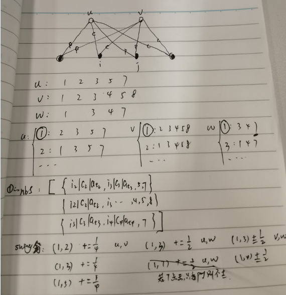 还有什么可提升的空间么?(a, b),(b, c), (a, c)之间都还有一条边,所有上边提到的算法,都是基于“点”计算节点相似性,并没有考虑中间节点的网络结构。在社会网络发展的研究领域中,有一个著名的理论,就是节点之间都在慢慢的相互之间连成三角形,其实s每加一个二跳节点为好友,都会新构成一个或多个三角形(close a triangle),比如s如果和w新建立了好友关系,[s, e, w]就构成了一个三角形,三角形在网络中是非常稳固的结构。