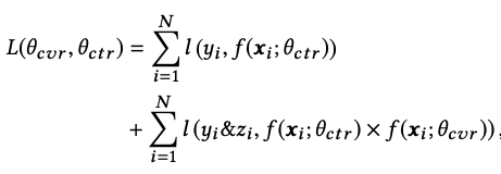 其中 z,y 分别表示conversion和click。注意到,在全部样本空间中,CTR对应的label为click,而CTCVR对应的label为click & conversion,这两个任务是可以使用全部样本的。