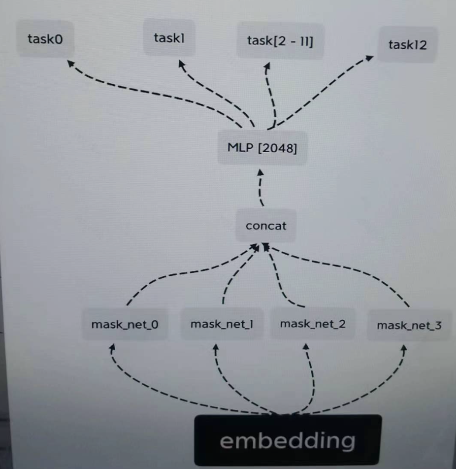 4 个结构一样的 mask_net,13 个多任务的输出头