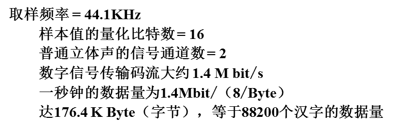 - 音频信号的传输率= 取样频率 × 样本的量化比特数 × 通道数。